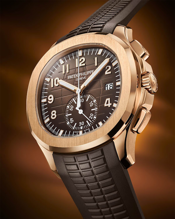 Der neue Aquanaut Chronograph Ref. Die Referenz 5968R-001 ist in Roségold mit einem braunen Zifferblatt mit Sonnenschliff und einem Rand mit schwarzem Farbverlauf erhältlich.